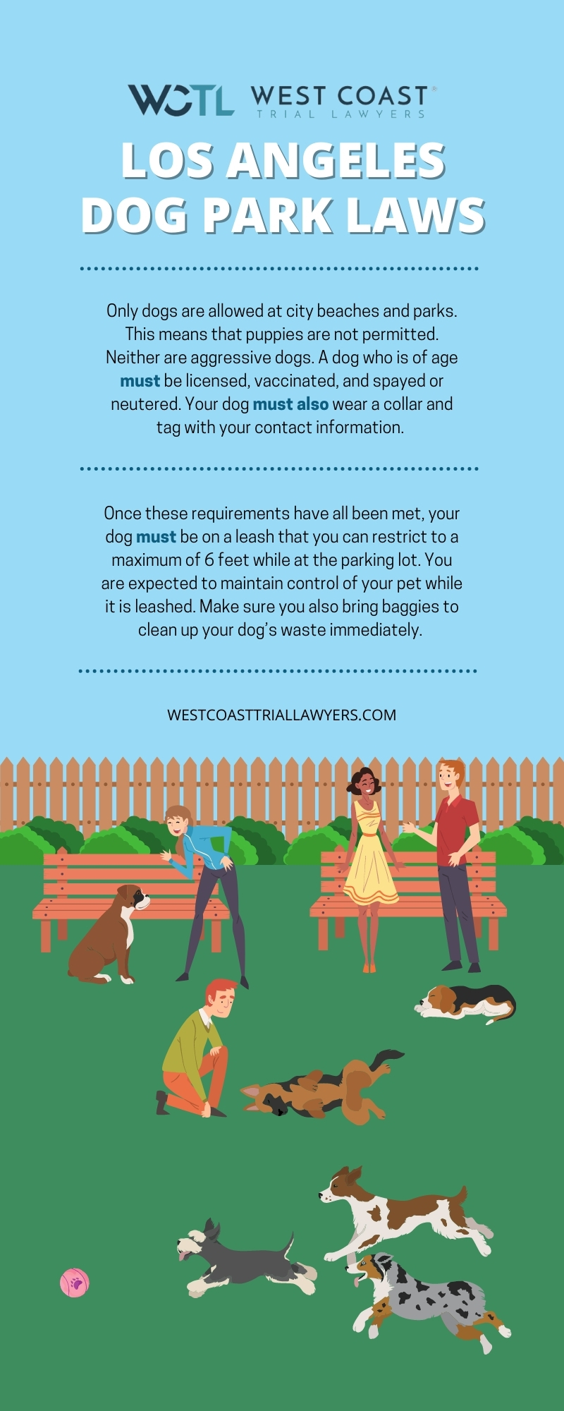 Below, our experienced Los Angeles dog bite attorneys will discuss the most important laws and regulations you must observe when visiting a dog park with your pet. If you have suffered a dog bite, West Coast Trial Lawyers is always here to answer any questions you may have about dog bite claims and available damages.