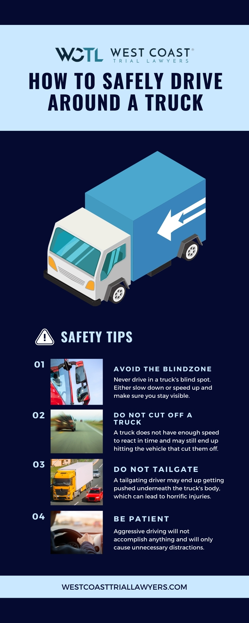 It’s important to understand that trucks, due to their size, will have larger blind spots, need more space to maneuver safely, and will also need more time and space to slow down or stop. It also takes more time and finesse for a driver to pass by a truck safely.